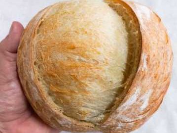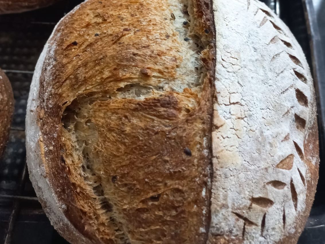 Pão de fermentação natural, sem aditivos químicos ou conservantes. Farinha + água + sal