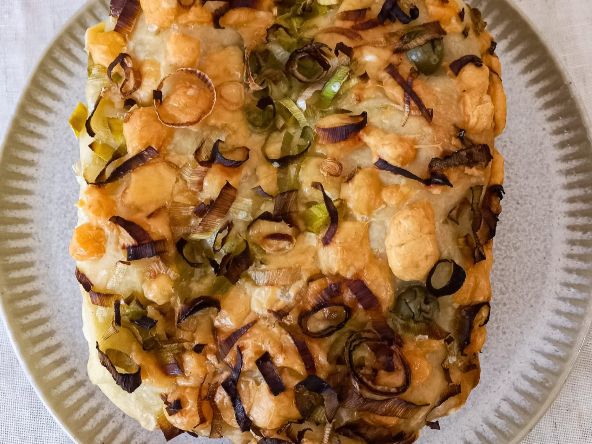 Fermentação natural, alho-poró delicadamente salteado e parmesão marcante gratinado na superfície. Massa macia, bordas douradas e aroma envolvente a cada fatia.